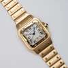 Le design de la Santos se distingue par sa sobriété et son audace pour l’époque. Le boîtier carré aux angles arrondis porte une lunette à vis apparentes et sépare la Santos des formes rondes dominantes à l’époque. Le boîtier intègre la lunette vissée, un détail esthétique qui deviendra plus tard une caractéristique emblématique de cette montre. Le cadran affiche des chiffres romains et une échelle des minutes en forme de chemin de fer, éléments reflétant le classicisme de Cartier.